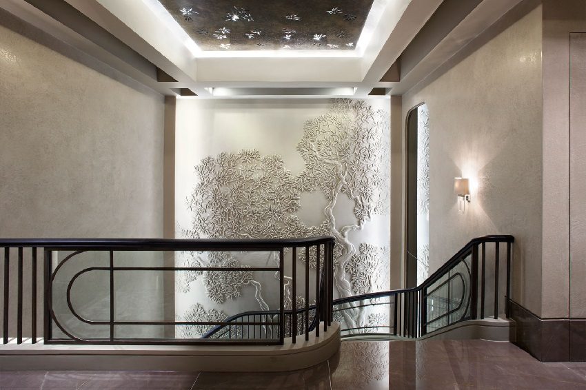 Коридор, зона прихожей, холла или лестницы также отлично смотрятся в шелковом оформлении. Тем более, что его мягкость и ненавязчивость не будет создавать резкий контраст при переходе в другие комнаты, отлично сочетаясь с любыми материалами и фактурами. Если для оформления небольшого помещения выбран темный цвет, позаботьтесь о многоуровневой системе освещения. Благодаря светоотражающим частичкам, даже темные стены не будут выглядеть тяжеловесными и тесными.