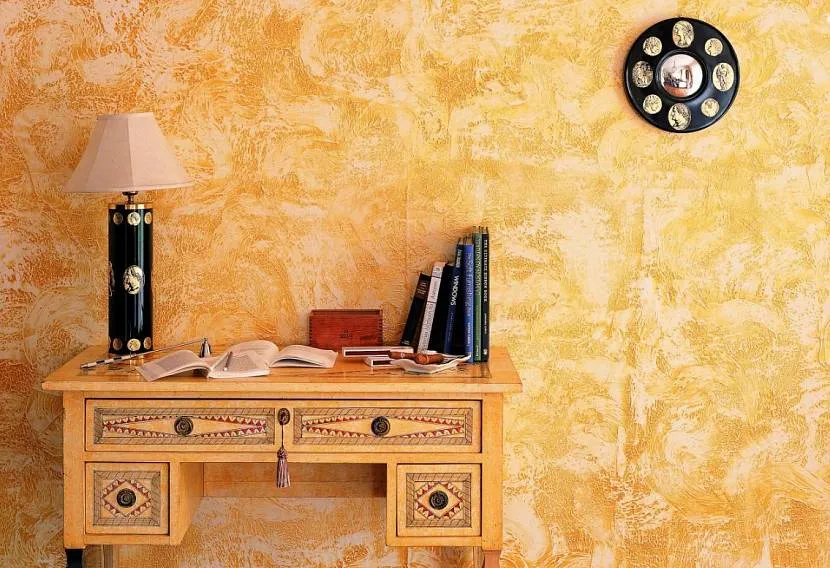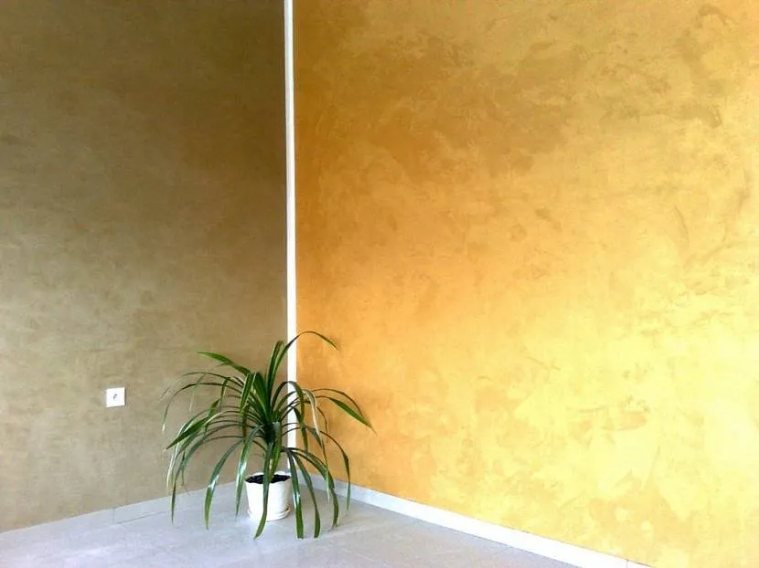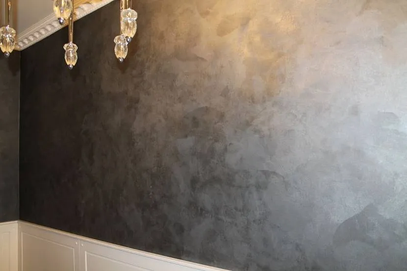 Слой шелковой штукатурки. Работать следует венецианской кельмой, покрывая последовательно площадь стены не более 2 м², и оставляя рваный край, который заглаживается при обработке соседнего участка.