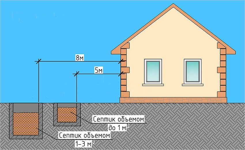 Месторасположение септика должно быть на расстоянии 4-5 метров от дома, 30 метров от открытого водоема и порядка 30-50 метров от скважины/колодца.