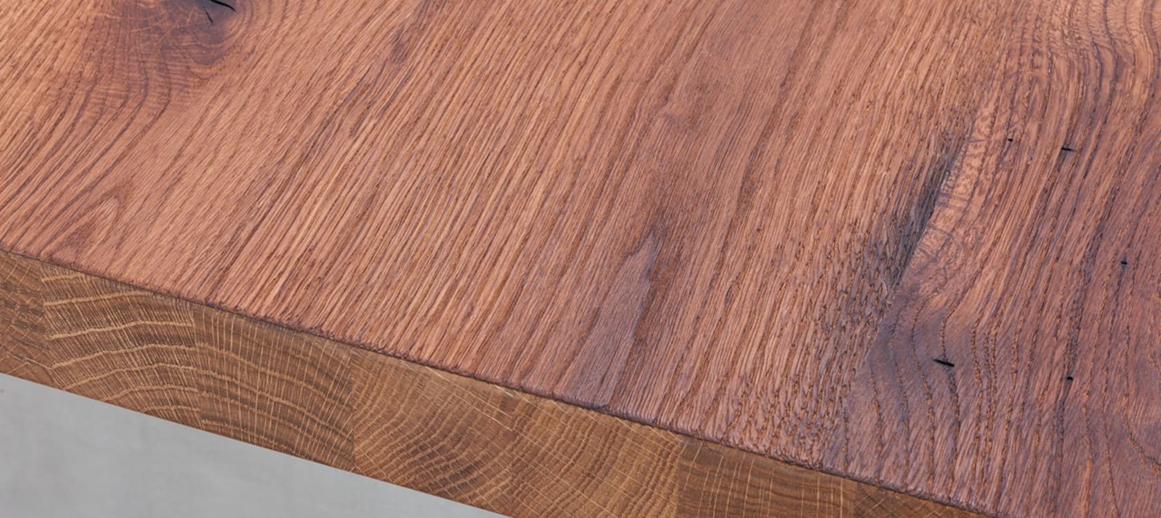 Стандартная толщина деревянной столешницы из массива – 40 мм, но можно встретить тонкие варианты – 20-30 мм, а также широкие – 50 мм. Поверхность рекомендуется оставить природного цвета, используют пропитку на масляной основе для защиты от агрессивной кухонной среды. Можно добавить тонер, морилку, актуальны оттенки венге, мореный или выбеленный дуб, вишня, махагон.