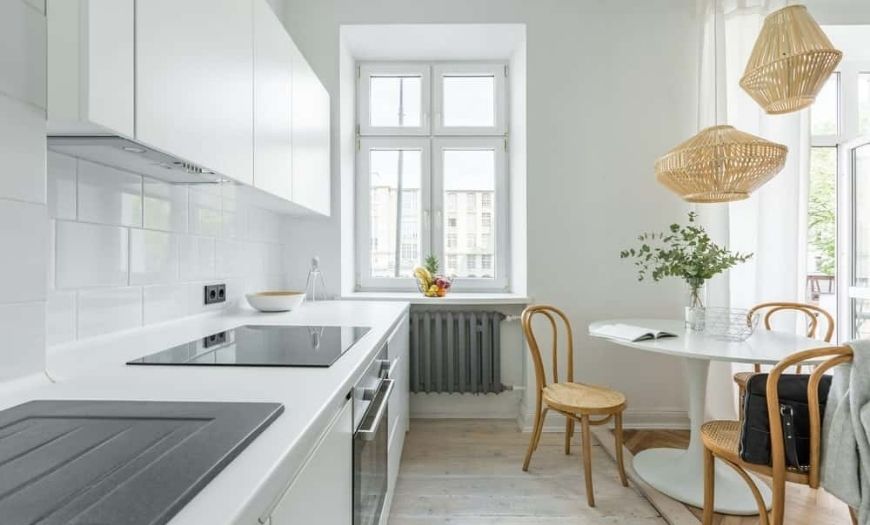 Свобода – одна из главных ценностей такого интерьера. Зачастую на маленьких сканди-кухнях нет штор и занавесок. А пространство под окном продолжает небольшая столешница или удачно расположенная рабочая зона, в самом светлом месте комнаты.