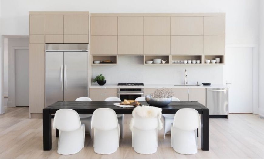 Стол чаще выбирают деревянный, лакированный либо окрашенный в белый цвет. Реже в скандинавских интерьерах встречается черная мебель. Для небольших кухонь допускается замена на барную стойку либо откидной столик-полку.