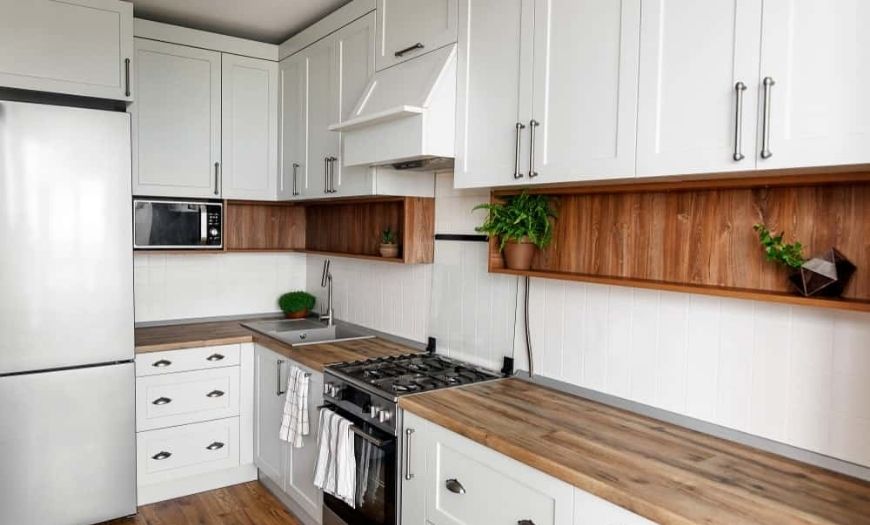 Выбираем стиль для белой кухни с деревянной столешницей
