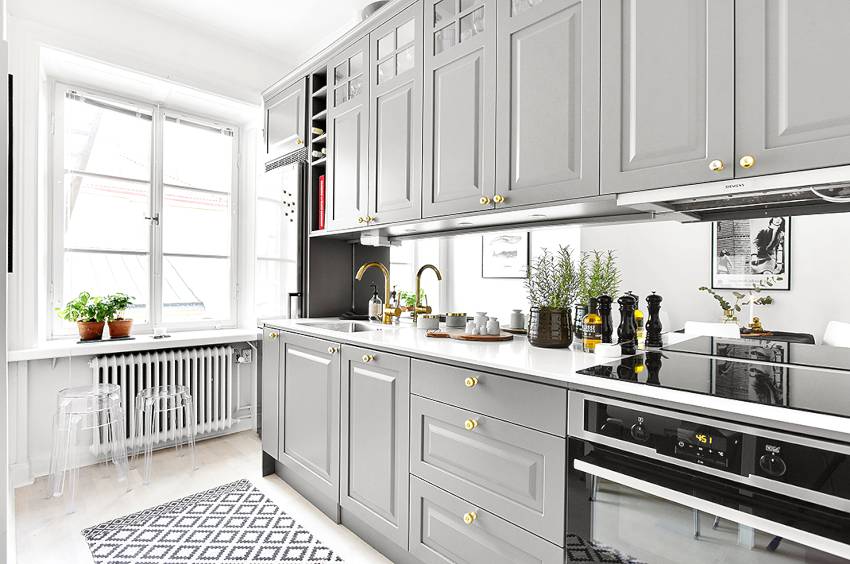Светлые оттенки серого выгодно смотрятся в интерьере небольшой кухни, размер которой визуально расширяется