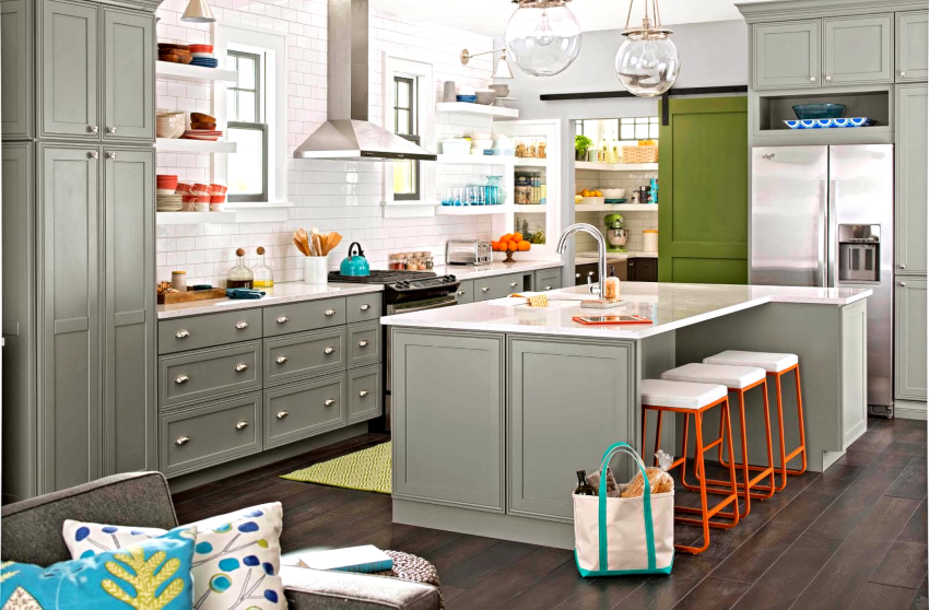 - Кухня в серых тонах с яркими акцентами