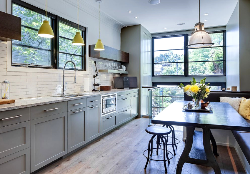 Цвета из желтой палитры идеально сочетаются со всеми оттенками серого, добавляя солнечности и свежести кухне.