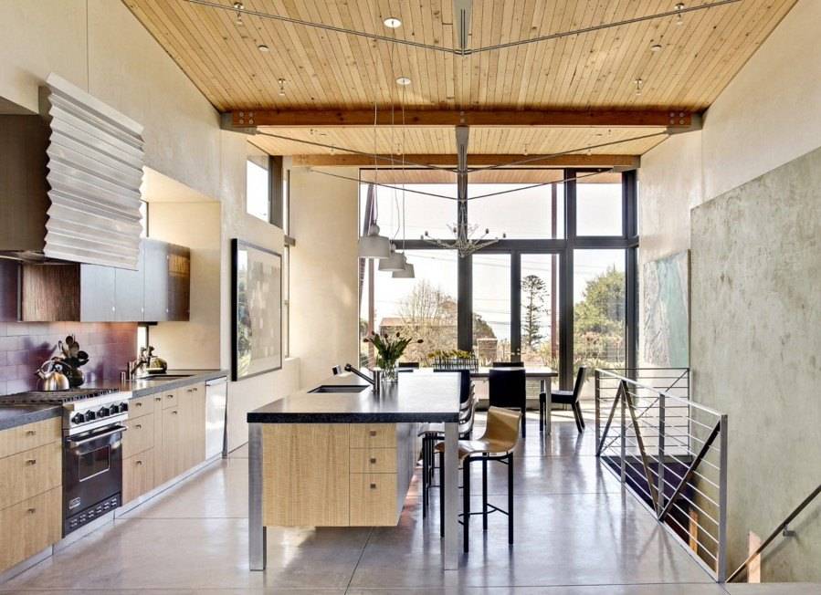 Этот стиль подходит обладателям квартир с высокими потолками. Его отличительными особенностями являются открытая планировка и совмещение разных архитектурных решений. Потолки и стены в таком помещении имеют грубую отделку. Конечно же, в огромном пространстве необходимо использовать зонирование. Вот с этой функцией в кухне-гостиной и справится барная стойка.
