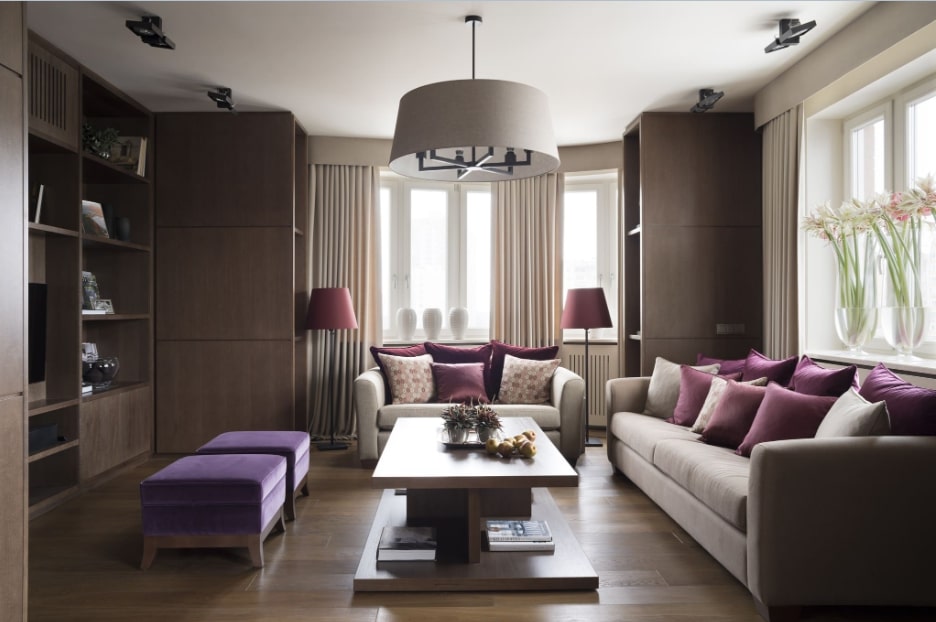 Мягкий диван в гостиной станет отличным место для просмотра фильма или чтения книги