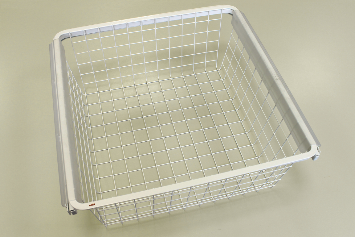 Корзину ёще называют mesh корзина. Выпускают корзину Эльфа на 1,2, 3 рельса и шириной 35, 45, 55 см. Стоят мелкоячеистые корзины примерно в два раза больше чем обыкновенные корзины, два варианта по глубине на 54 см и 44 см в соответствии с глубиной стеллажа.