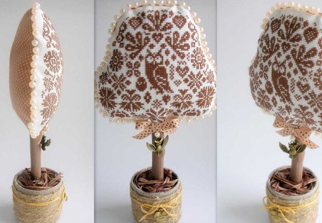 Заготовку, набитую синтепоном, не зашивайте полностью. Оставьте немного места в нижней части, чтобы в него вставить деревянный ствол, покрытый лаком. Разведите гипс с водой в равных пропорциях и залейте в приготовленное кашпо. Вставьте в него деревянную палку, на которую предварительно была установлена синтепоновая подушечка. В дополнение ко всему, готовую поделку можно еще украсить подвесками и бантиками.