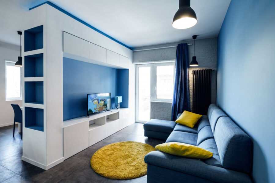 Синий диван в интерьере гостиной комнаты