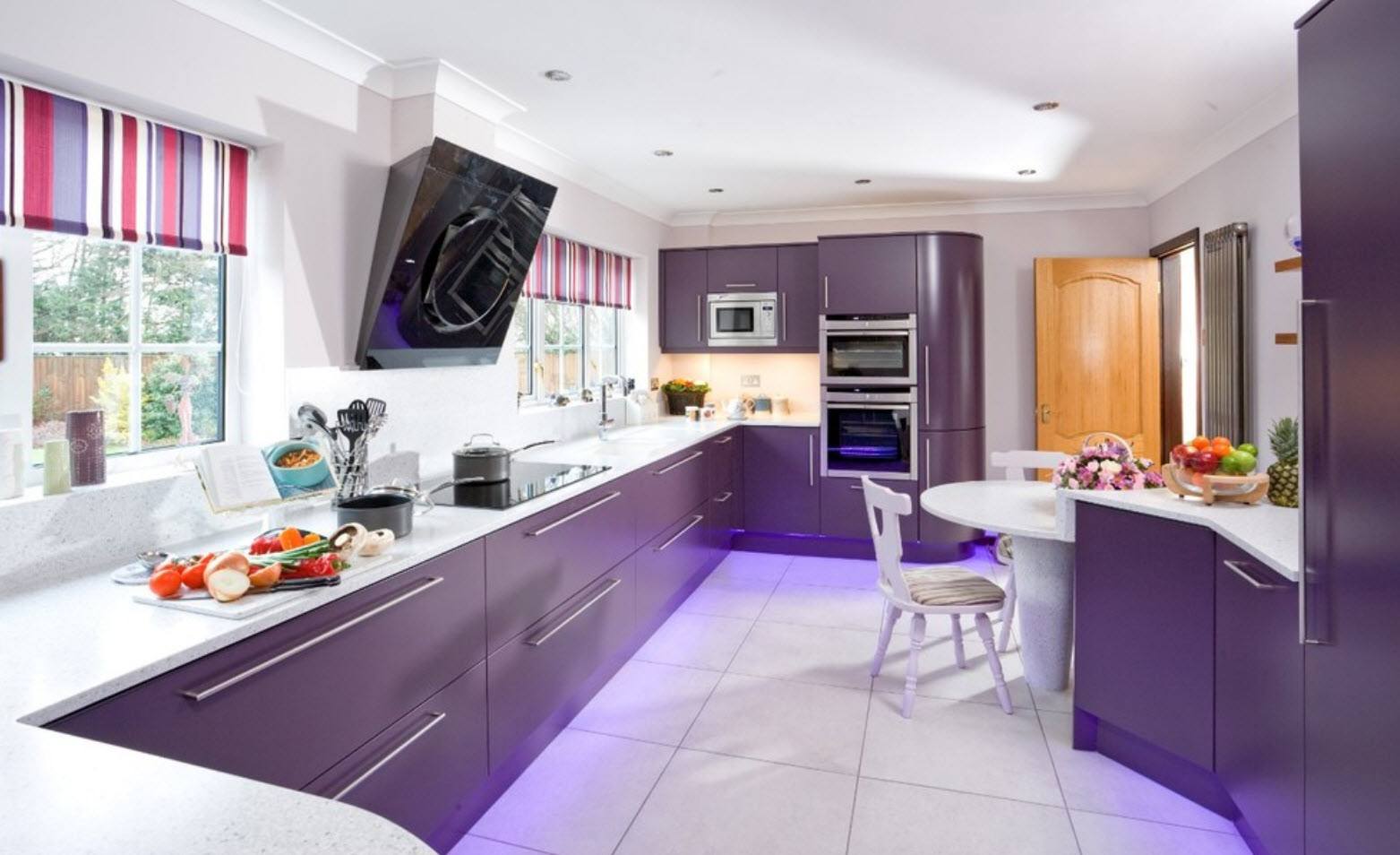 На фото дизайнов интерьеров лиловых кухонь можно увидеть варианты в стилях: