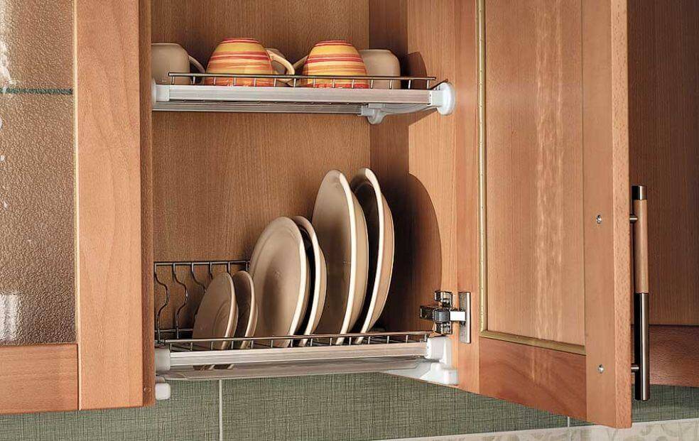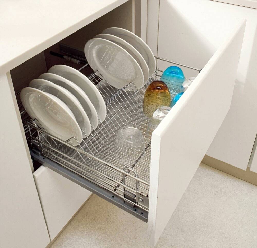 - сушилка для посуды – обязательный атрибут для кухни, обычно размещается в закрытом отделении шкафа, благодаря ей кухонные принадлежности быстро высыхают;