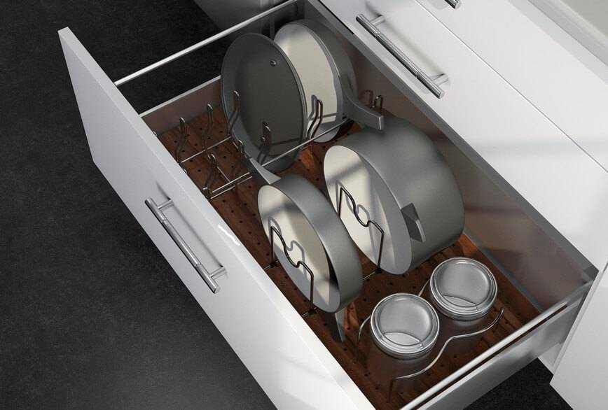 Ну и внутреннее хранение – для тех, кто неприемлет открытый способ. Это может быть шкаф или выдвижной ящик. Можно использовать внутреннюю часть двери, подвесив специальное приспособление – держатель для крышек. Его также можно ихготовить самим или купить готовую систему.