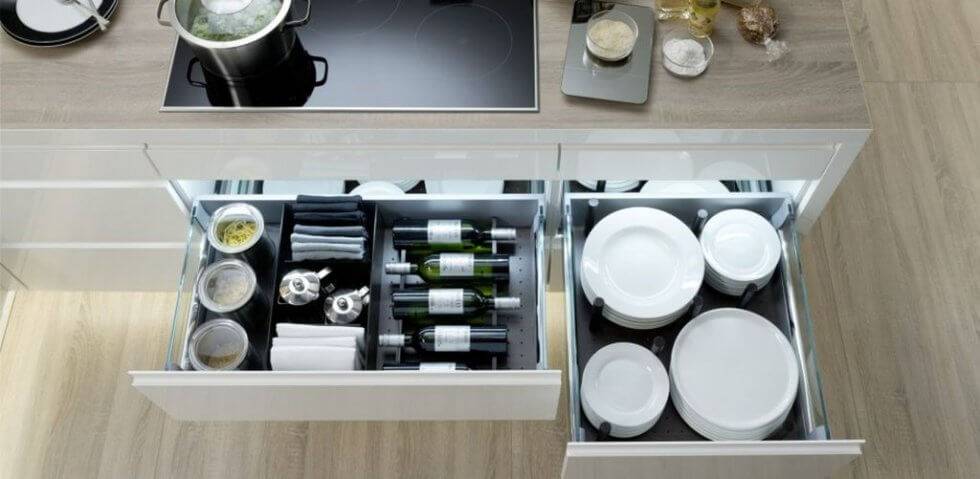 Выдвижные ящики могут быть разделены на множество секций, где удобно размещать кухонную утварь. Под столешницей самое место выдвижной разделочной доске, ниже стоит разместить съемные лотки контейнеры.