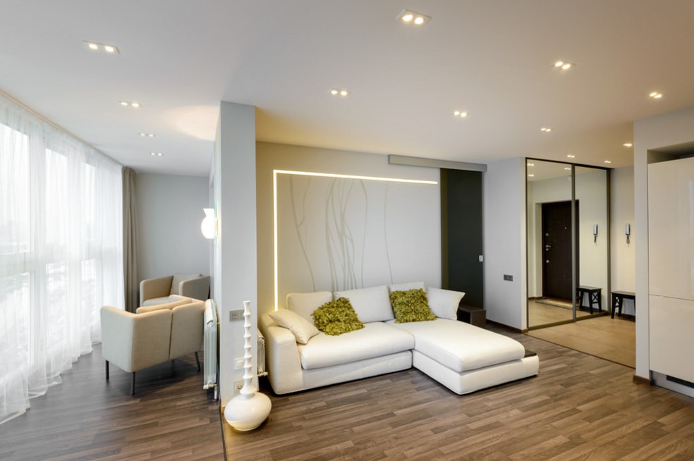Такие светильники не нагреваются, создавая безопасные условия эксплуатации изделия. При выборе монтажа встроенного освещения внутри врезного шкафа необходимо позаботиться о нем до момента установки каркаса. Можно осветить мебель снаружи, что достигается путем монтажа ламп в карнизы мебели.