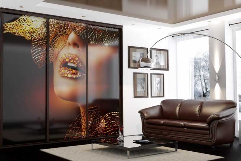 - В небольшой гостиной крупный рисунок или фотопечать на фасаде гардероба будет «съедать» объем комнаты.