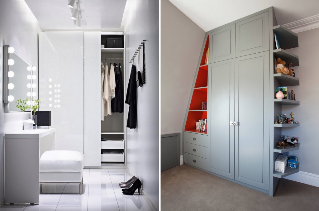 Независимо от выбранного варианта, размещайте зону гардеробной у входа в комнату. Избежать сужения пространства будет сложно, но зато вы получите полноценное место для хранения вещей, о котором многие могут только мечтать.