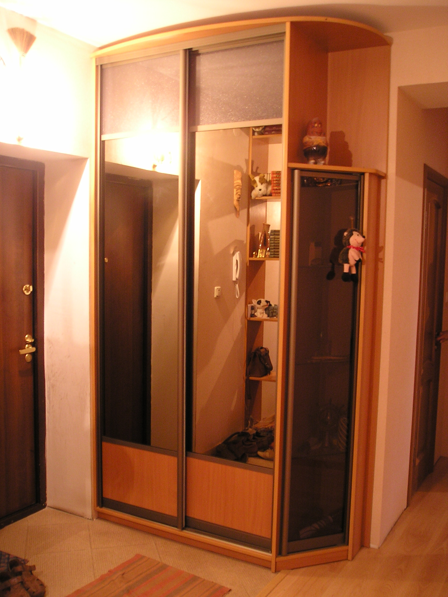 Второе типичное место размещения встроенных шкафов – угол в прихожей. Для встроенного шкафа используются две стены, а фасад его может быть линейным или изогнутым.
