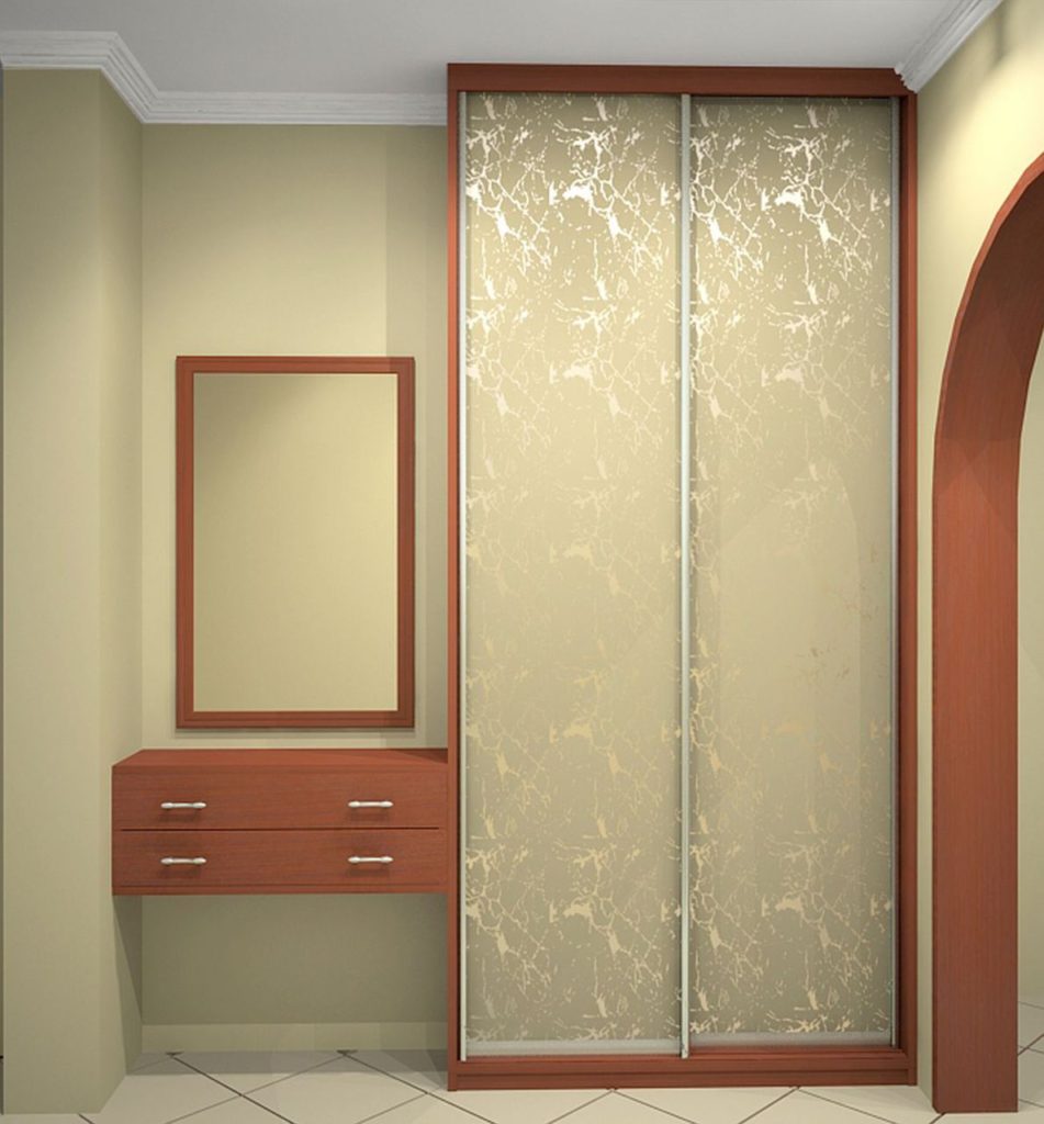 - встроенные шкафы (фасад — зеркало или стекло: обычное, крашеное, матированное, глянцевое), изготавливаемые под заказ обойдутся в 20-55 000 руб.;