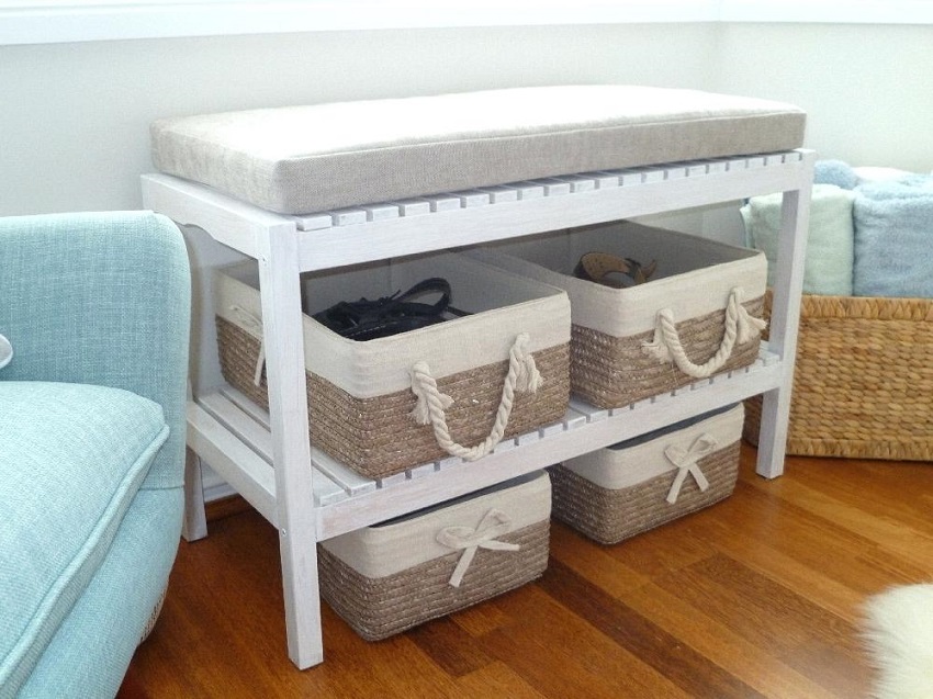 С помощью необходимого материала и инструментов, можно сделать, как небольшую по размеру скамью, так и удлиненную для большой семьи. Дополнить подобный предмет мебели можно, либо подушками, подходящими по цветовой гамме к прихожей, так и интересными покрывалами или ковриками ручной работы, добавляющие теплоту и уют в дом.