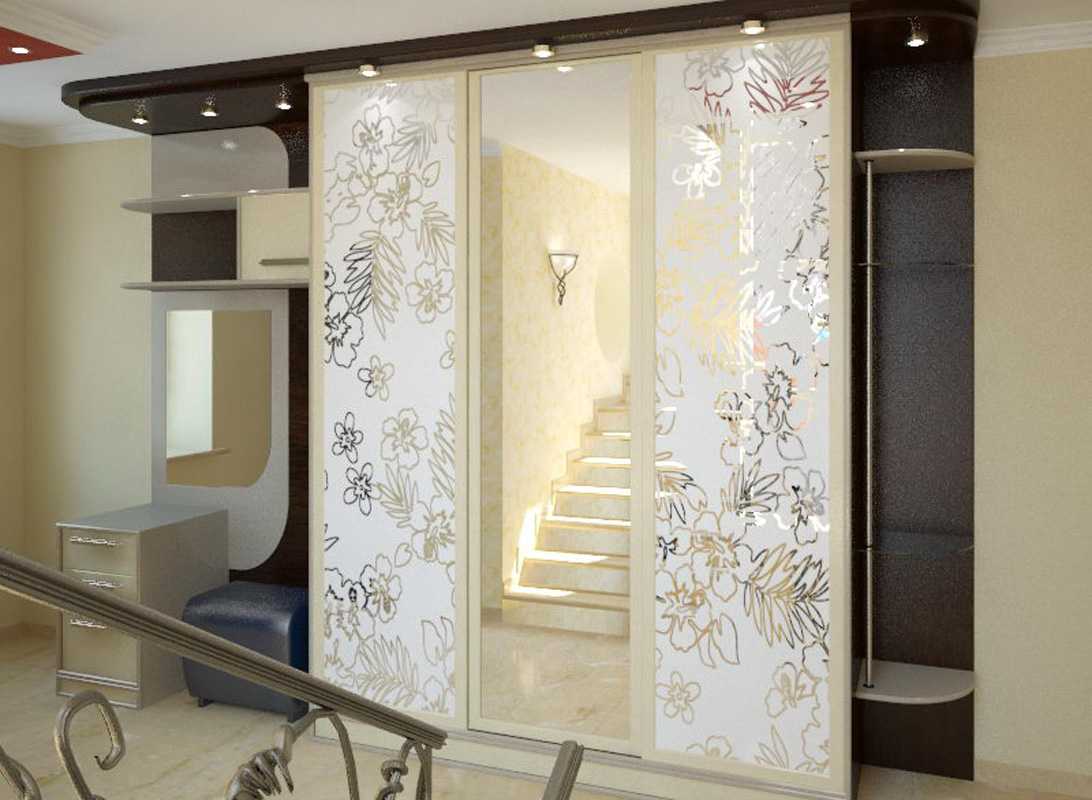 - Зеркало. Очень распространенный материал. На поверхность по пескоструйной технологии наносят рисунки. Они могут покрывать зеркало почти целиком, оставляя небольшие фрагменты нетронутого зеркала, а могут быть нанесены лишь фрагментами. Зеркальный шкаф купе