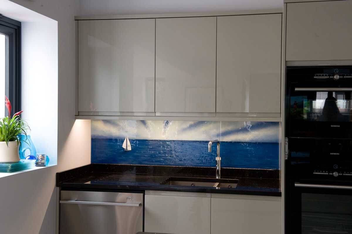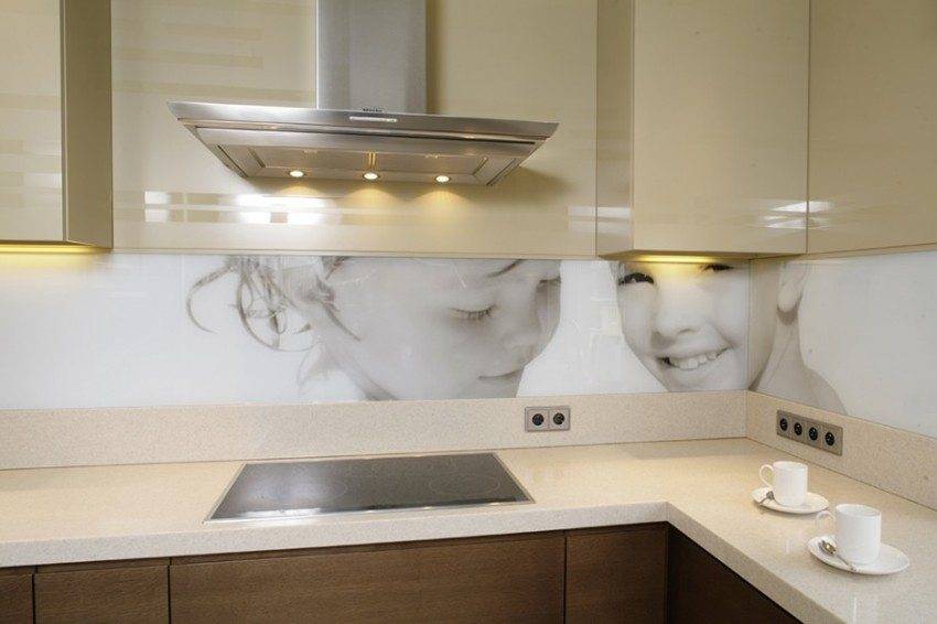 Замена привычной керамики в отделке фартука на необычную панель из стекла придаст обстановке индивидуальность. Такой декор может претендовать на звание эксклюзивного, особенно, если на панно появятся кадры, повествующие о вашей личной жизни.