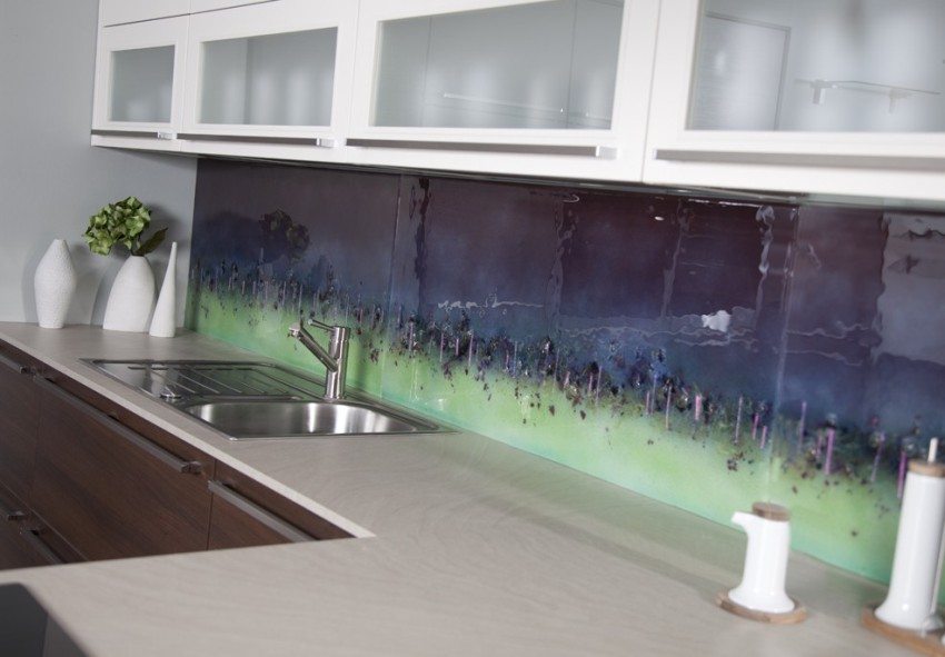 При выборе стекла под скинали для стильной кухни следует учесть следующий момент. Может оказаться так, что для идеально четкой реализации задумки придется покупать специфическое осветлённое стекло. Нюанс в том, что обычное стекло, хоть и кажется реально прозрачным, но при покрытии рисунка, выполненного на светлом фоне, оно проявит свой бутылочный оттенок, «наградив» шедевр зеленцой, хотя при использовании его в симбиозе с натюрмортами, городскими панорамами, пейзажными изображениями – ничего подобного заметно не будет.