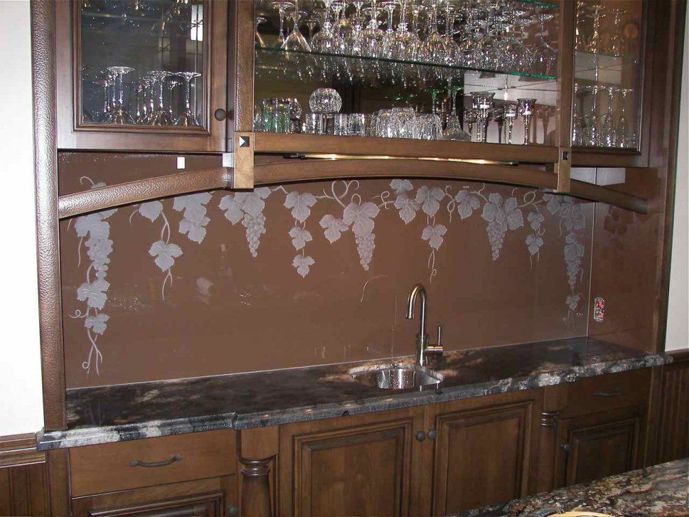 Зеркало вместо стекла. Точно такие же способы декорирования можно применить и к зеркальной панели. Ведь зеркало – это и есть стекло, но с нанесённой на заднюю поверхность (или один из слоёв стекла) амальгамой. Очень впечатляюще будет смотреться художественная гравировка на таком фартуке. Благодаря отражению рисунок обретает глубину, а зеркальная поверхность не сильно бросается в глаза.