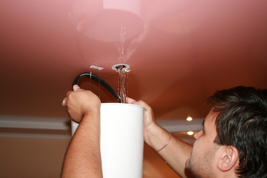 Сливать воду надо очень осторожно, чтобы не подвергнуть деформации потолок. Самое главное — сохранить полотно целым