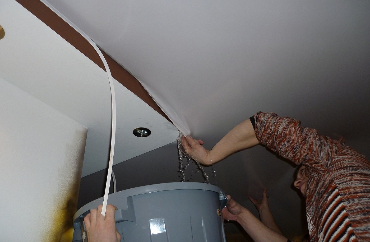 Очень важно как можно быстрее остановить воду, чтобы предотвратить обрыв полотна. Если жидкость поступает из верхней квартиры, нужно сразу поставить в известность соседей. Они отключат воду