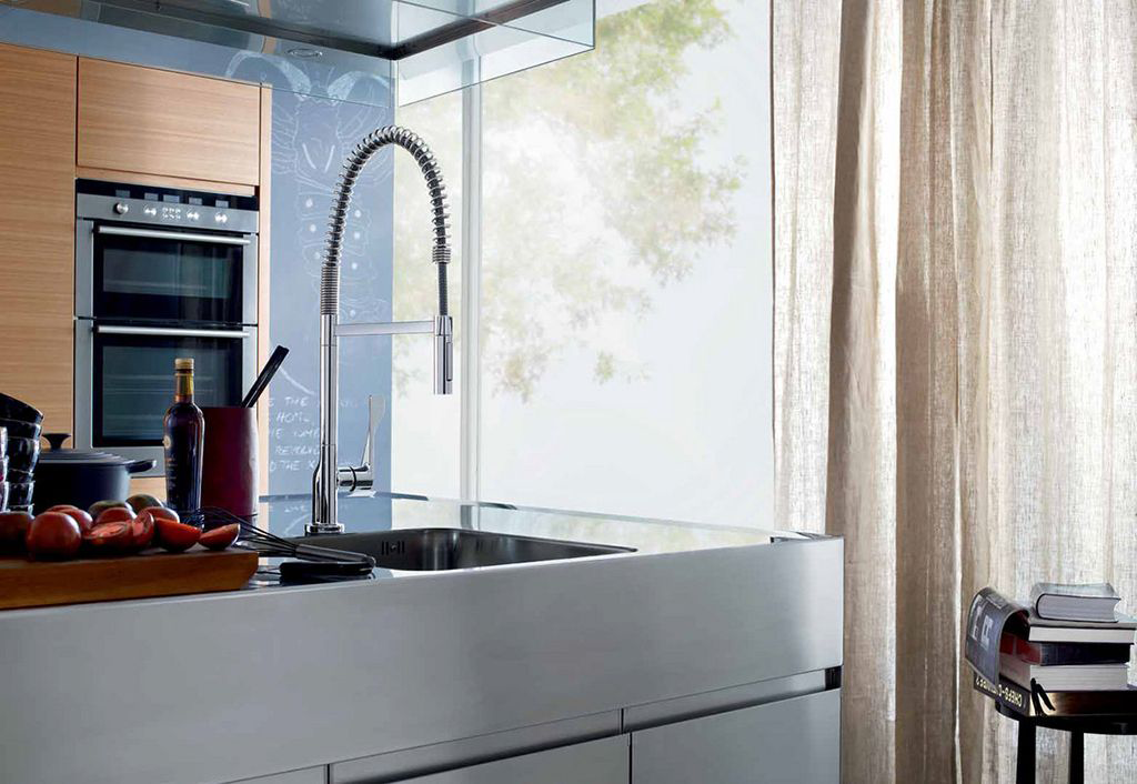 А вот если на кухне установлено несколько больших моек, тогда необходимо выбирать полупрофессиональные модели. Длинный шланг позволит дотянуться в любое место и благодаря сильной струе воды тщательно вымыть посуду или продукты. Эти модели больше всего подходят к стилю хай-тек или минимализм, дизайн изготовления – привлекательный.