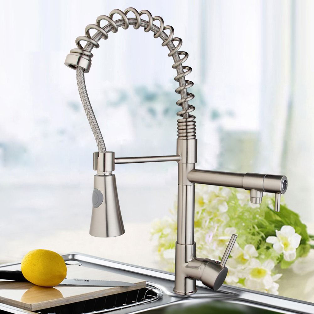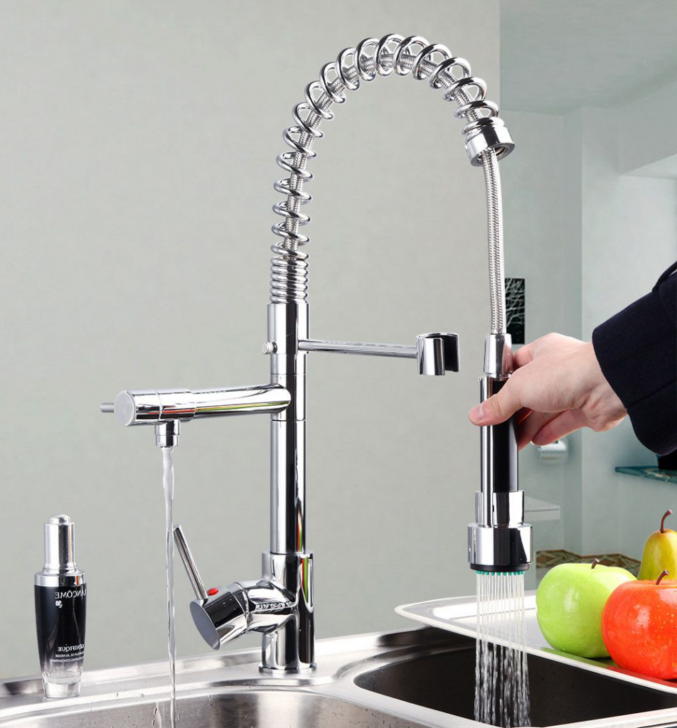 Кстати, полупрофессиональные смесители с пружиной очень похожи на приборы с выдвижным изливом, но разница состоит в том, что излив с пружиной полностью гибкий и легче переключается на «душевую лейку». К тому же, «полупрофы» имеют специальный поворотный держатель для лейки.