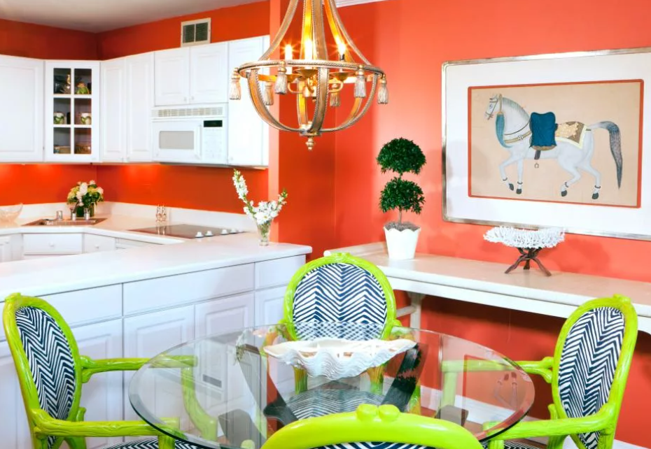 Интересные результаты дает совмещение с оранжевым цветом в интерьере кухни ярких тонов: