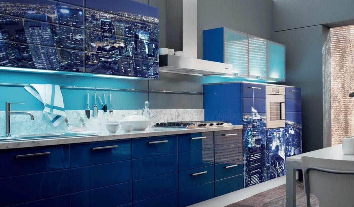 При подборе голубого кухонного гарнитура нужно соблюдать осторожность, поскольку переизбыток голубого цвета приводит к переутомлению людей, находящихся в помещении