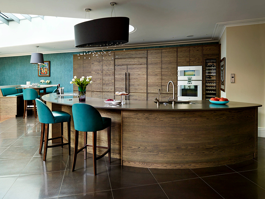 Важно отметить, что чем ярче используемый бирюзовый цвет, тем светлее должны быть оттенки-спутники, хотя нередко можно встретить такие варианты, когда темный насыщенный синий цвет кухни применяется в сочетании с шоколадным оттенком или цветом темного дерева. Если кухня отличается большими размерами, можно выбрать строгий вариант, используя бирюзово-черное оформление