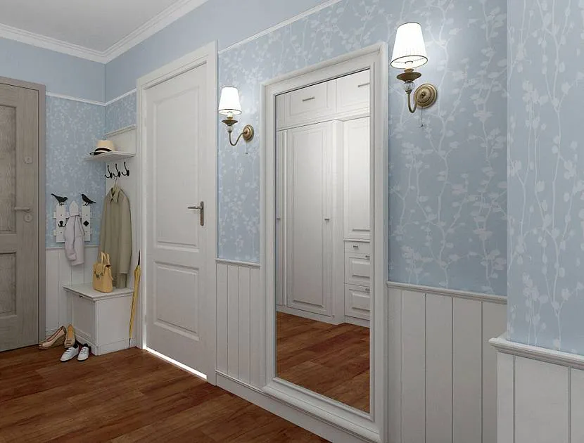 Красиво смотрятся в коридоре четко очерченные панели из вагонки. Они прекрасно сочетаются с фактурной штукатуркой, обоями или краской.