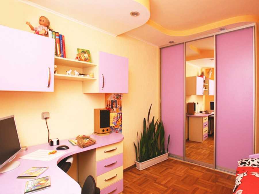 Если часть комнаты отделать нежно-розовой или нежно-голубой вагонкой, то в сочетании с яркими фасадами мебели, это придаст комнате особый уют и тепло. По краям вагонки монтируют багет, чтобы разграничить материалы отделки.