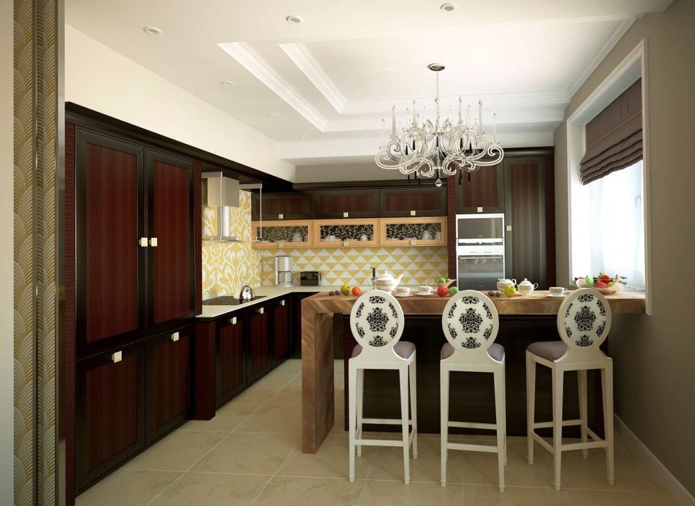 Интересно сыграть на контрастах: к примеру, темная кухонная мебель в сочетании со светлыми стульями и столешницами. Необходимые акценты расставляем с помощью аксессуаров.