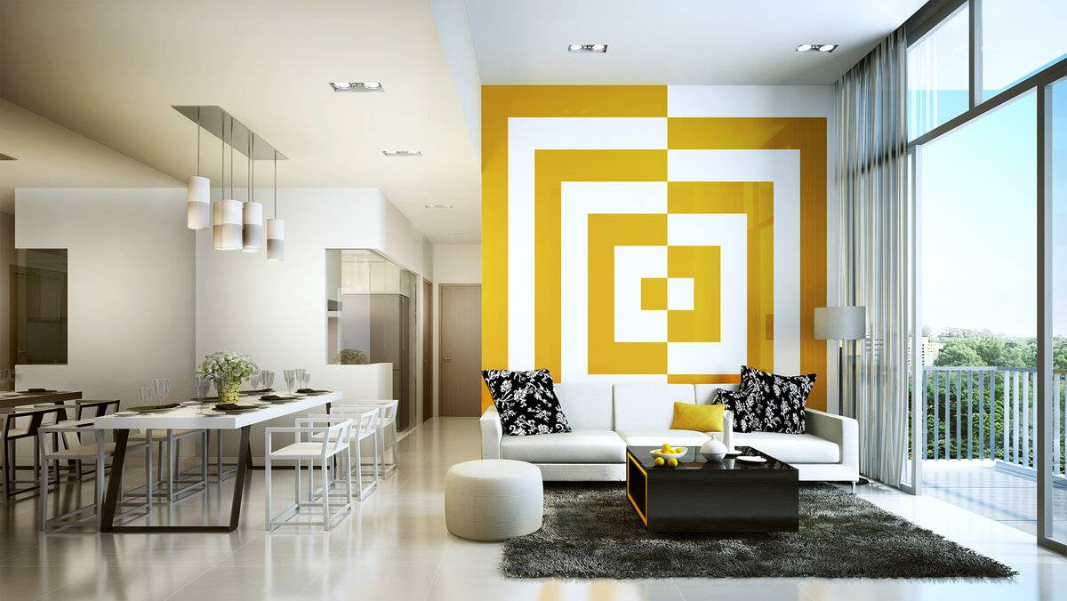 Чаще всего акцентной стеной становится та, на которую падает взор при входе в помещение. Яркий оттенок или объемное изображение «придвинет» стену, таким приемом можно длинную узкую комнату немного приблизить к форме квадрата. В зависимости от стилистического направления основной цвет может быть близок по тональности с акцентной стеной или кардинально отличаться.
