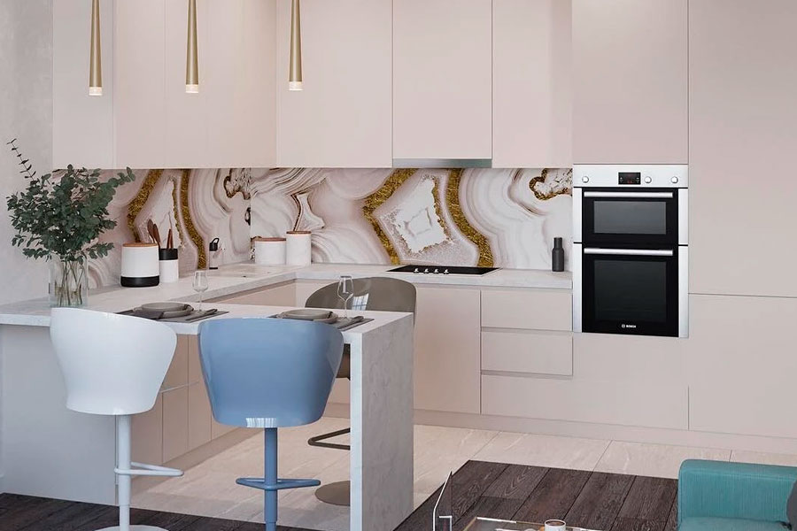 - совмещенная барная стойка на кухне 12 кв. м является продолжением одной из поверхностей гарнитура, придавая окружению утонченный, современный вид;