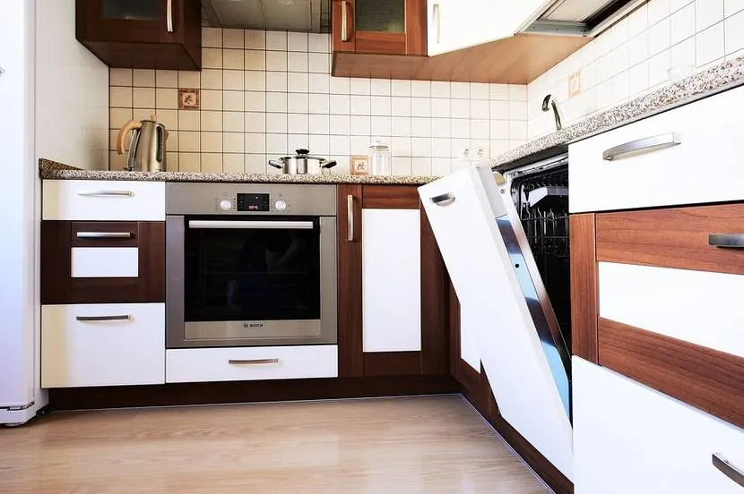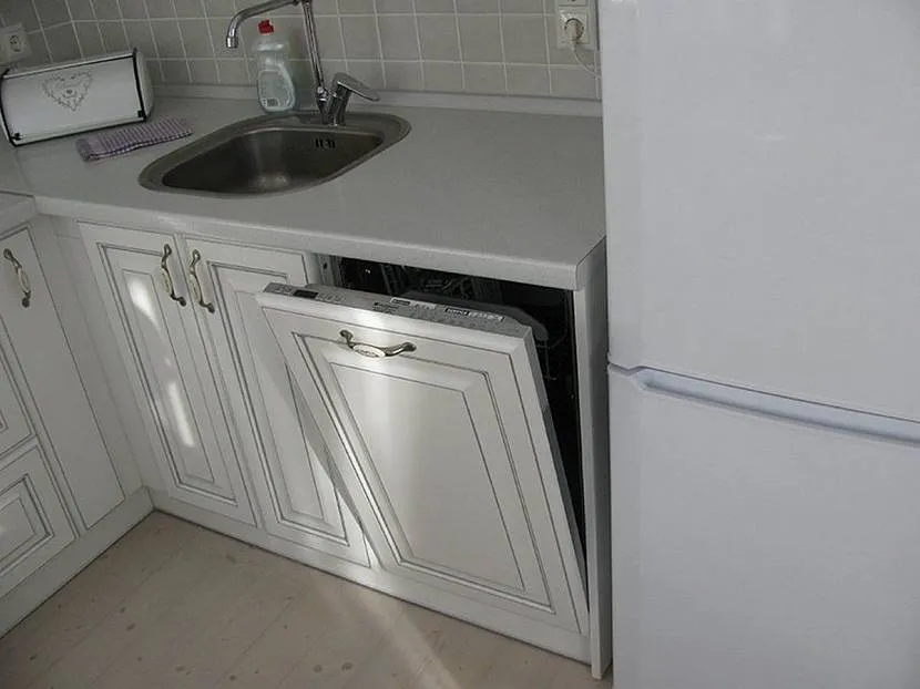 В дизайн компактной кухни 8 м легко вместить полезное устройство. Выбирают миниатюрную модель, которую монтируют в гарнитур. Бытовую технику ставят на расстоянии не более 0,9 м от мойки. Посудомоечную машинку нельзя устанавливать вплотную к стене или располагать со стороны углового модуля. Элемент добавляют к нижнему ярусу встраиваемой колонны.