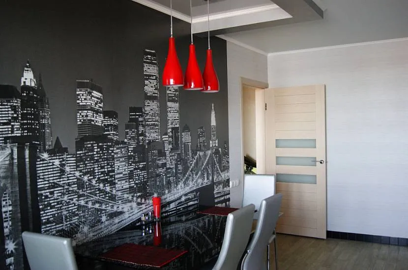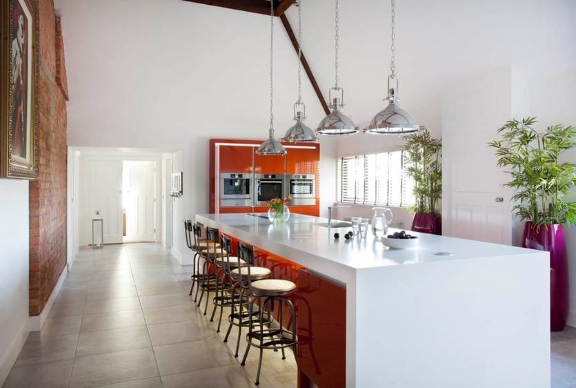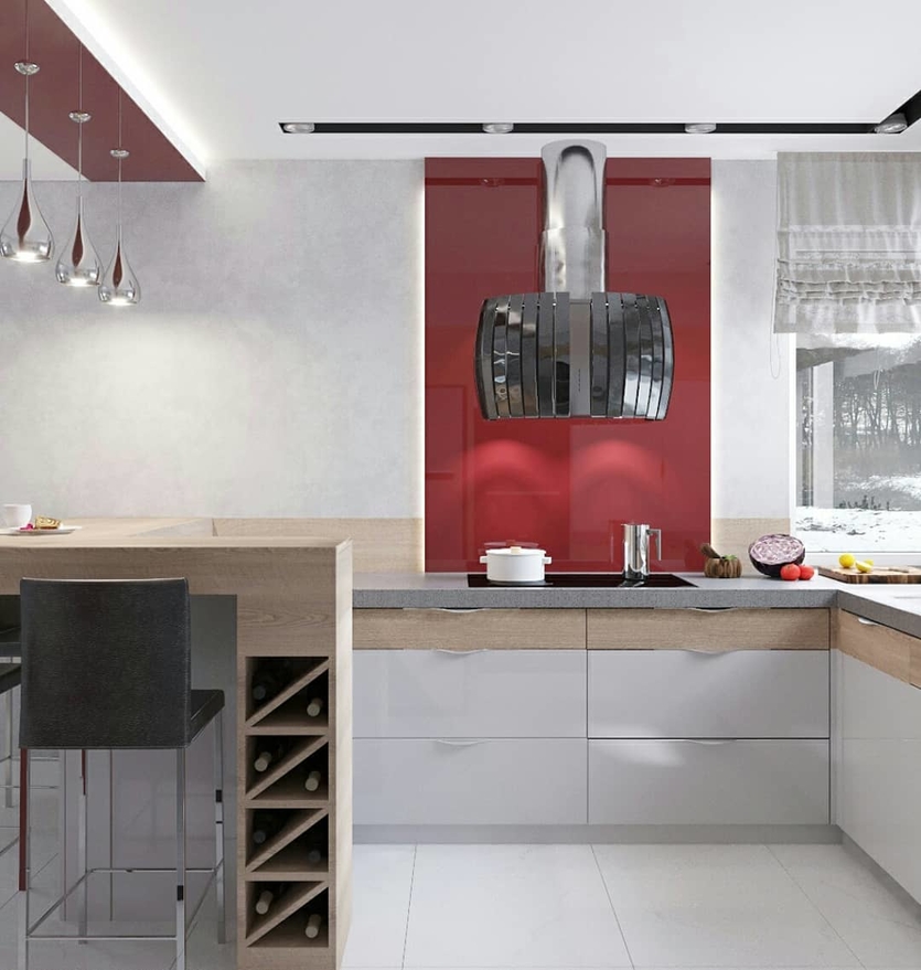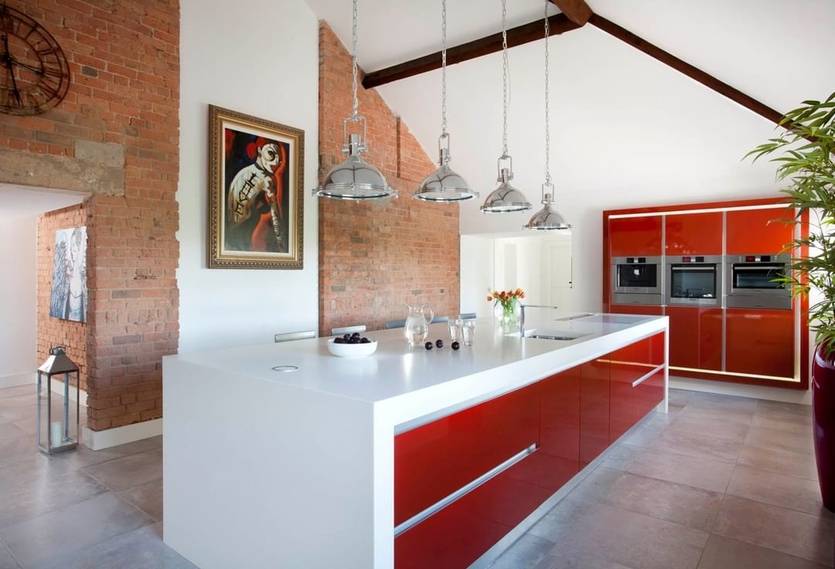 Алый и его тона стоят в тандеме с разными оттенками: белым, серым, черным. Для интерьера в стиле классик характерно применение облицовки пола и потолка белого цвета. Оригинально смотрится красная люстра на белом потолке. В других местах кухни размещают небольшие настенные светильники в контрастных. Такие идеально впишутся над обеденной зоной.