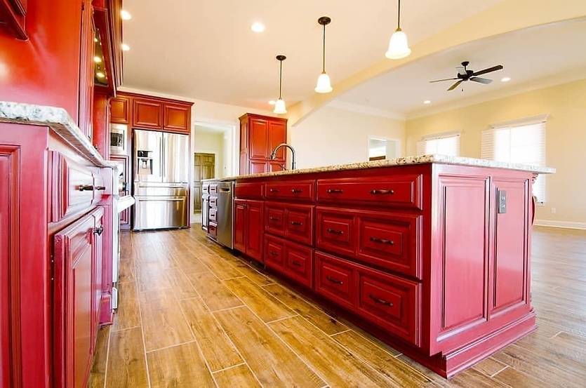Выбор строится на основании дополнительного оттенка, который будет присутствовать в интерьере. На кухне отлично смотрятся теплые тона – тициановый, коралловый, алый, морковный, киноварь. Холодные тона, которые имеют легкую примесь синего, используются в кухнях, выходящих окнами на юг. Это кармин, ализарин, малина, кардинал.