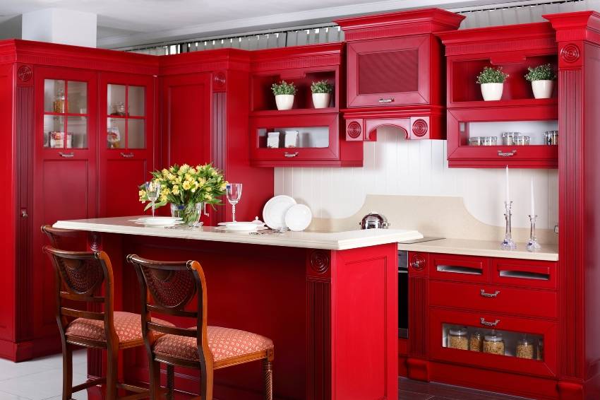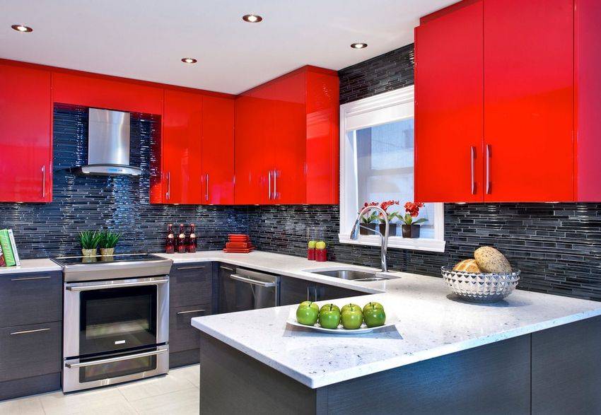 Если отделка стен имеет нейтральный цвет, то вполне допустим красный кухонный гарнитур