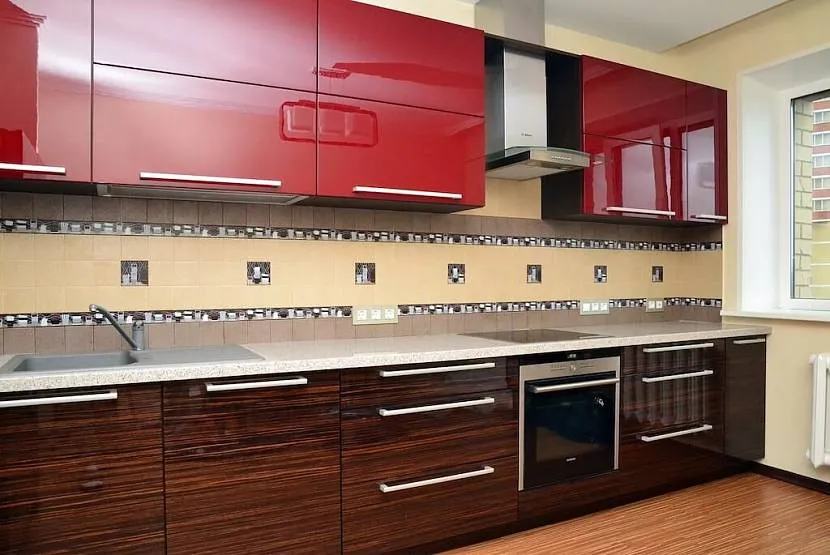 Здесь нередко можно увидеть комбинированные фасады — например, белый верх, бордовый низ. Другой вариант — верх может быть тоже не однотонным. Здесь могут присутствовать и винные, и белые вставки. Вместо белого в той же степени можно использовать светлый серый и цвет металла или бежевый.