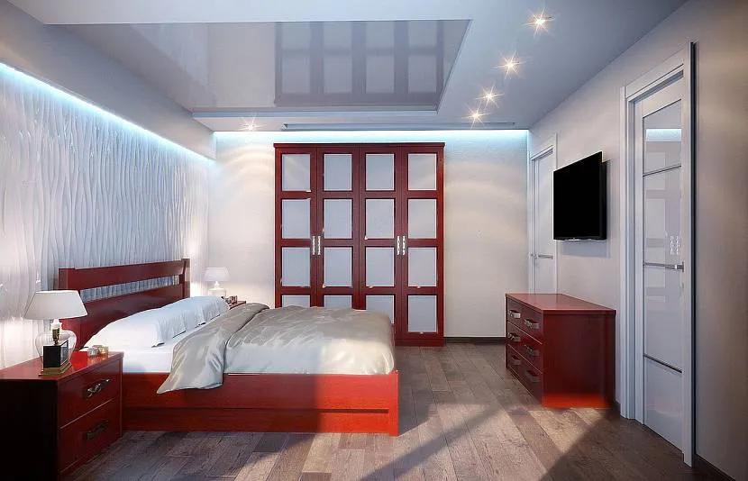 - Глянец. Если в спальне есть шкафы, тумбы и другая мебель — пусть их дверцы будут глянцевыми, а не матовыми.