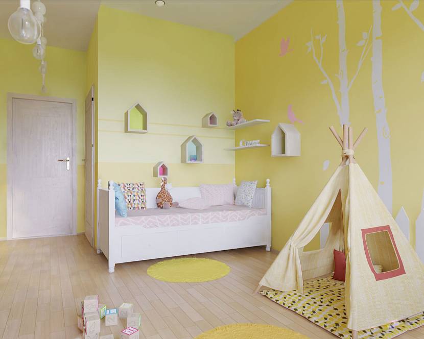 Желтый. Светло-желтый оттенок — идеальный вариант для малогабаритной детской, особенно, если ее окна выходят на север. Желтые стены поднимают настроение, заряжают энергией и стимулируют мыслительные способности. Все желтые оттенки гармонично сочетаются с белым, серым, зеленым, коричневым тоном. Насыщенные краски (фиолетовую, оранжевую) добавляются дозировано, чтобы не вызвать усталость глаз.