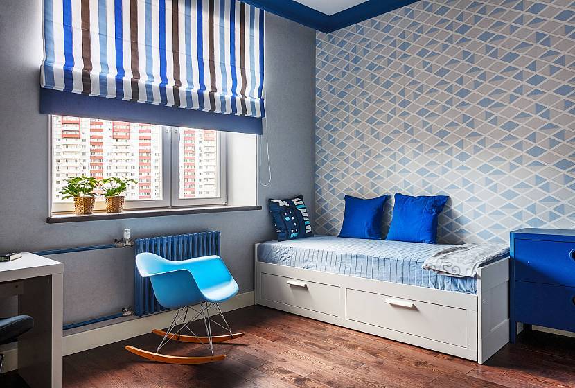 Синий. Вопреки расхожему мнению, дизайн детской комнаты 10 кв. м в оттенках синего подходит как мальчикам, так и девочкам. Подбираются разные дополнительные цвета. Для мальчиков — белый, оранжевый и коричневый, для девочек — белый, бежевый и другие пастельные оттенки.