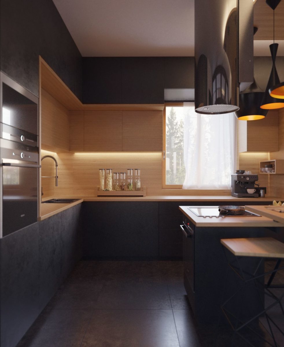 Искусственный свет немного исправляет обстановку, но рассчитывать на теплую и уютную атмосферу не стоит — для этого лучше выбирать светлые матовые фасады.